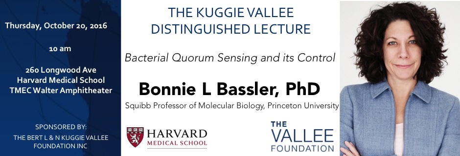 Bonnie Bassler, PhD, Squibb Professor of Molecular Biology at Princeton University, gave a lively talk on the molecular mechanisms that bacteria use for intercellular communication as the inaugural Kuggie Vallee Distinguished Lecturer. The Lecture was given at Harvard Medical School (HMS) on October 20, 2016. To a packed auditorium, Dr Bassler explained that by secreting molecules that can be recognized by surrounding bacteria, a process called quorum sensing, bacteria control pathogenicity as collectives. Using vibrio cholerae, the bacterium that causes the disease cholera, as her example, she explained how bacteria behave differently when they are alone compared to when they are members of larger communities. The cholera bacterium, and many other pathogens, require quorum sensing to cause devastating diseases. Dr Bassler’s lab is now targeting communication systems to develop anti-quorum sensing molecules as new anti-microbials.